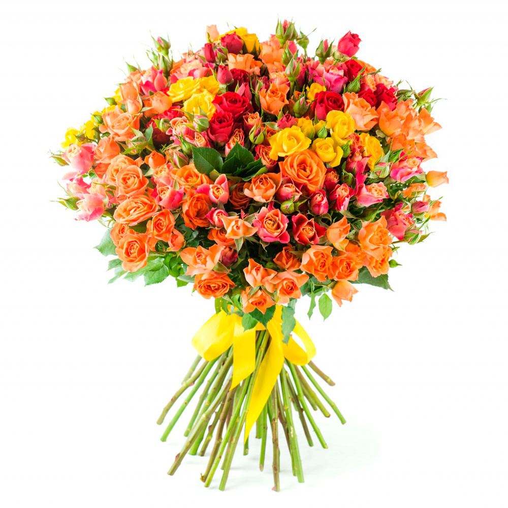 Роза кустовая микс (желтая, оранжевая, розовая). Упаковка (лента, пленка, крафт, сетка, пленка матовая)
