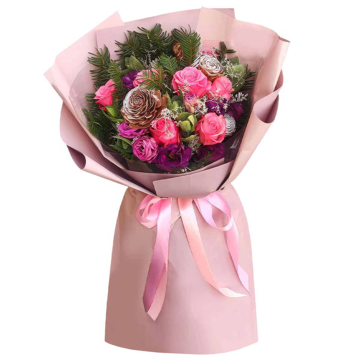 Роза одноголовая розовая, брассика, пихта, эустома фиолетовая, роза кустовая пионовидная розовая, сухоцветы. Упаковка (лента, пленка, крафт, сетка, пленка матовая)