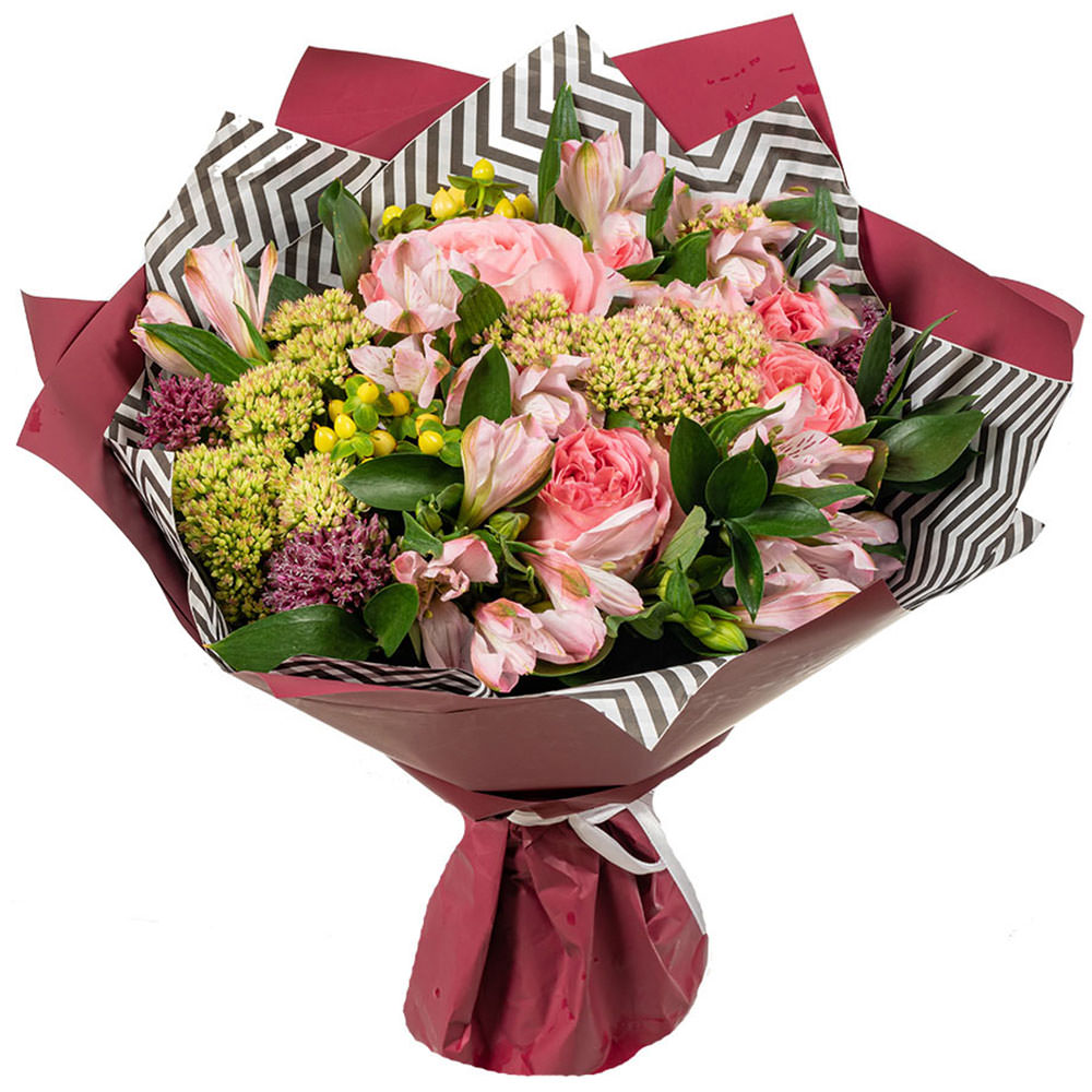 Роза одноголовая розовая, альстромерия розовая, илекс, озотамнус. Упаковка (лента, пленка, крафт, сетка, пленка матовая)