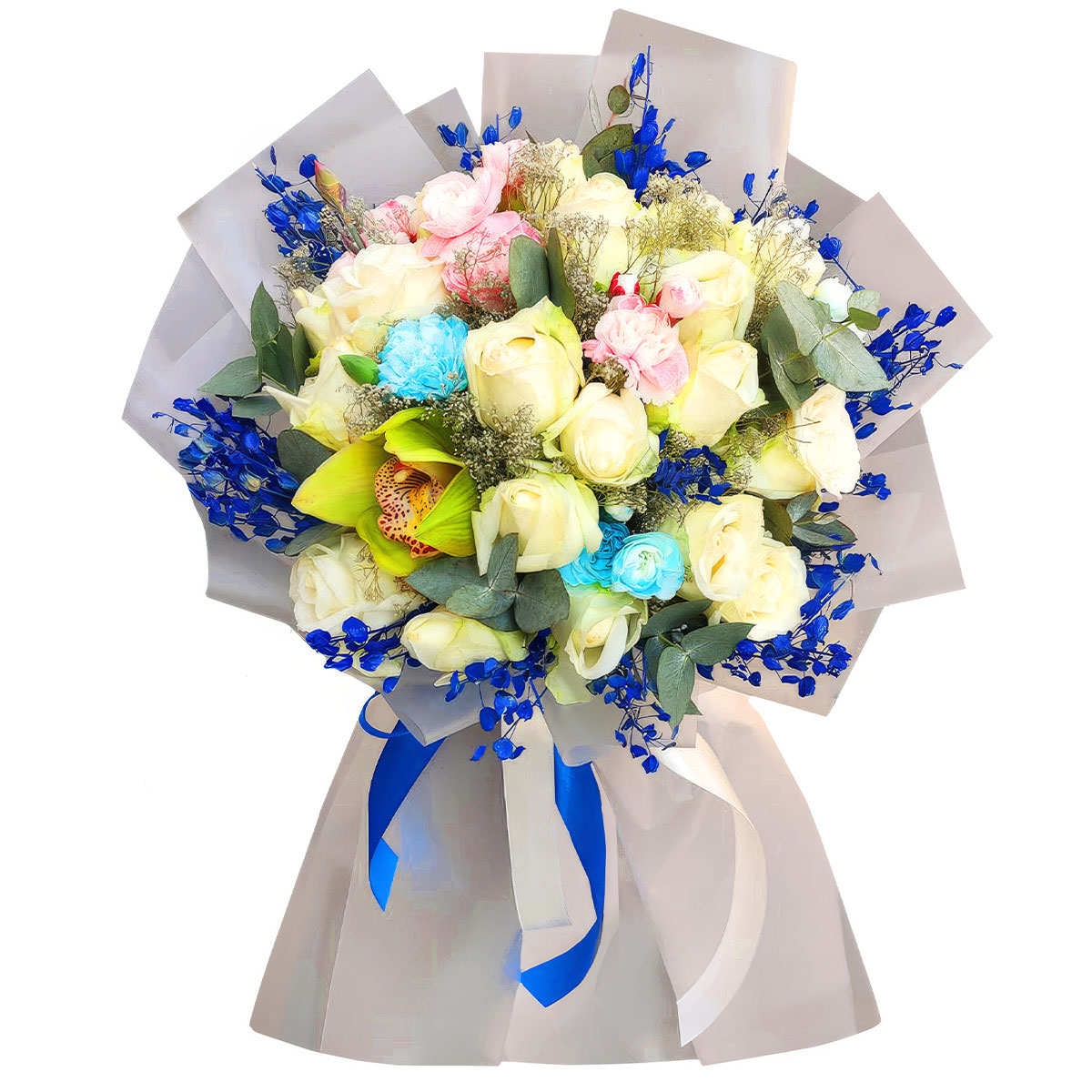 Роза кустовая белая, орхидея желтая, лунария голубая, эустома, эвкалипт. Упаковка (лента, пленка, крафт, сетка, пленка матовая)