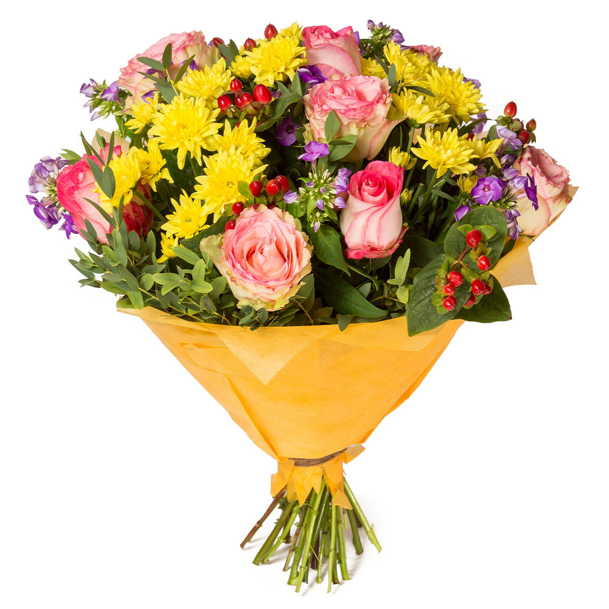 Роза одноголовая розовая, хризантема кустовая желтая, флокс фиолетовый, гиперикум. Упаковка (лента, пленка, крафт, сетка, пленка матовая)