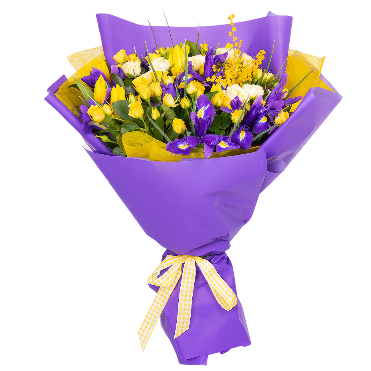 Роза кустовая желтая и белая, тюльпан желтый, мимоза, ирис фиолетовый, рускус. Упаковка (лента, пленка, крафт, сетка, пленка матовая)