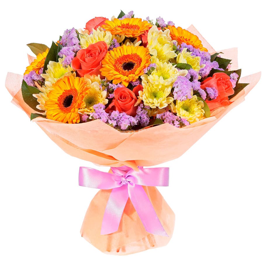 Гербера желтая, хризантема кустовая желтая, роза одноголовая красная, статица. Упаковка (лента, пленка, крафт, сетка, пленка матовая)