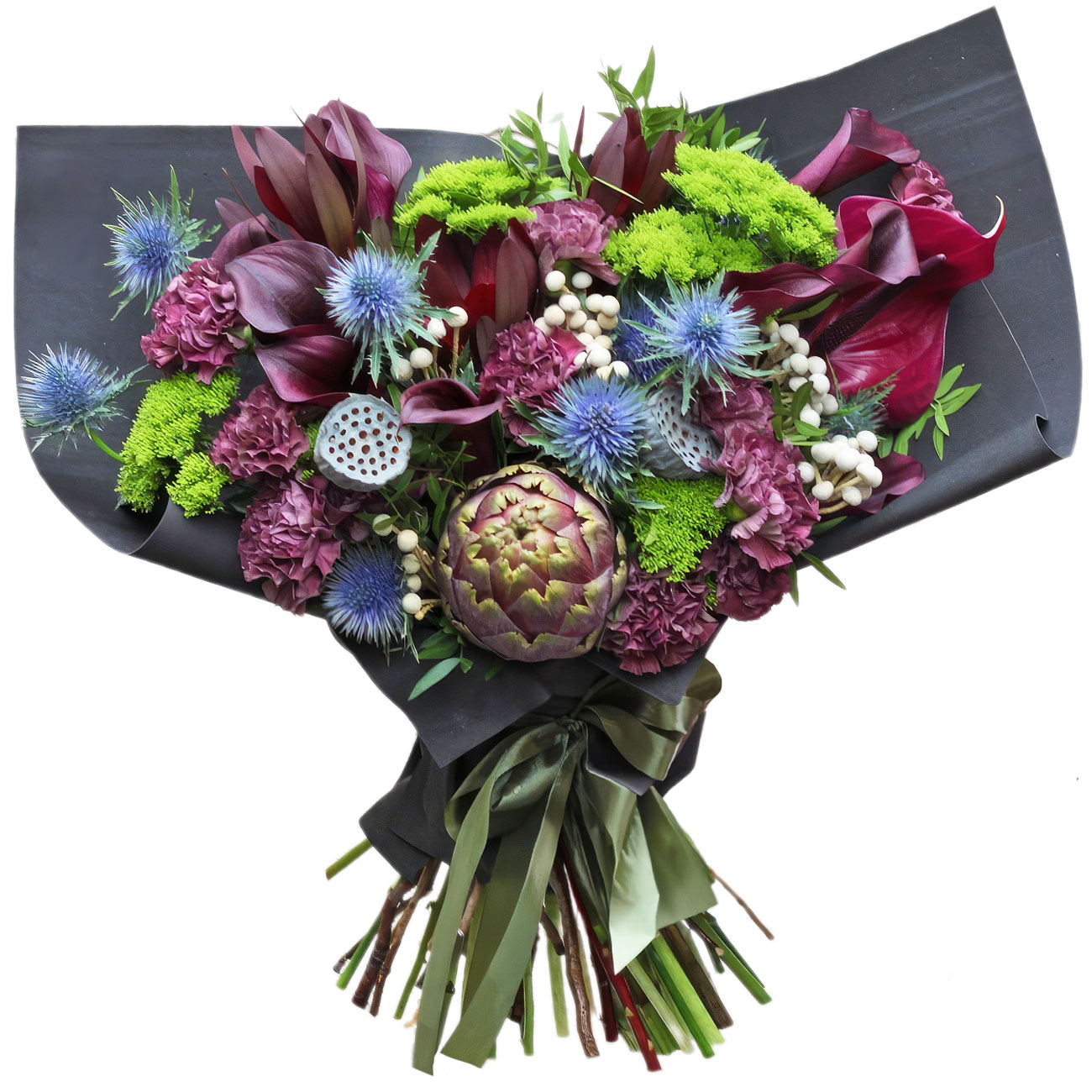 Эрингиум, артишок, калла бордовая, лотос, гвоздика сиреневая, зелень. Упаковка (лента, пленка, крафт, сетка, пленка матовая)