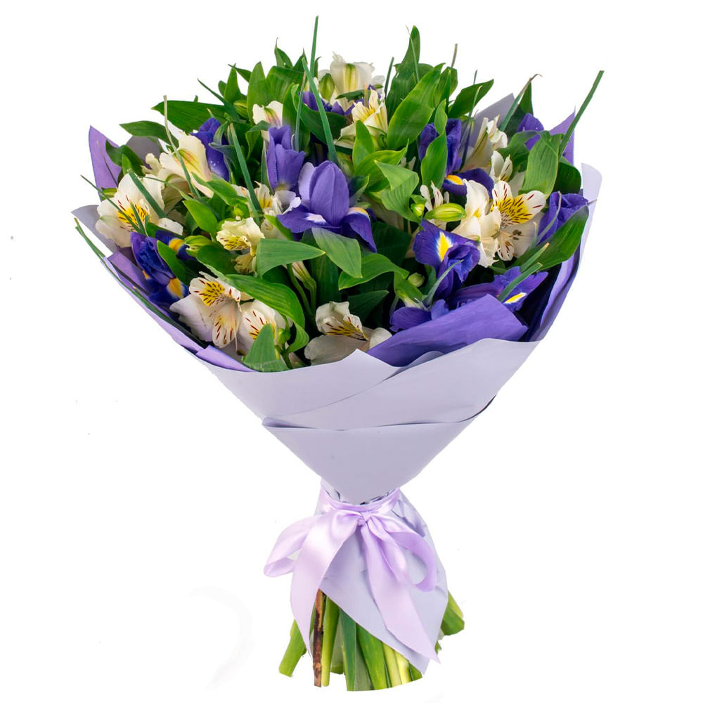Ирис, альстромерия белая, зелень. Упаковка (лента, пленка, крафт, сетка, пленка матовая)