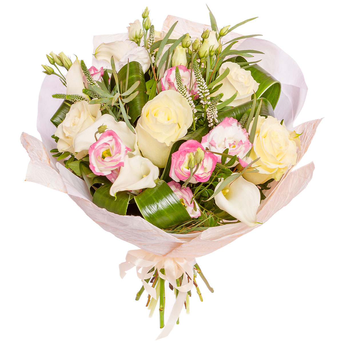 Роза одноголовая чайная, эустома розовая, калла белая, вероникаструм виргинский, аспидистра. Упаковка (лента, пленка, крафт, сетка, пленка матовая)