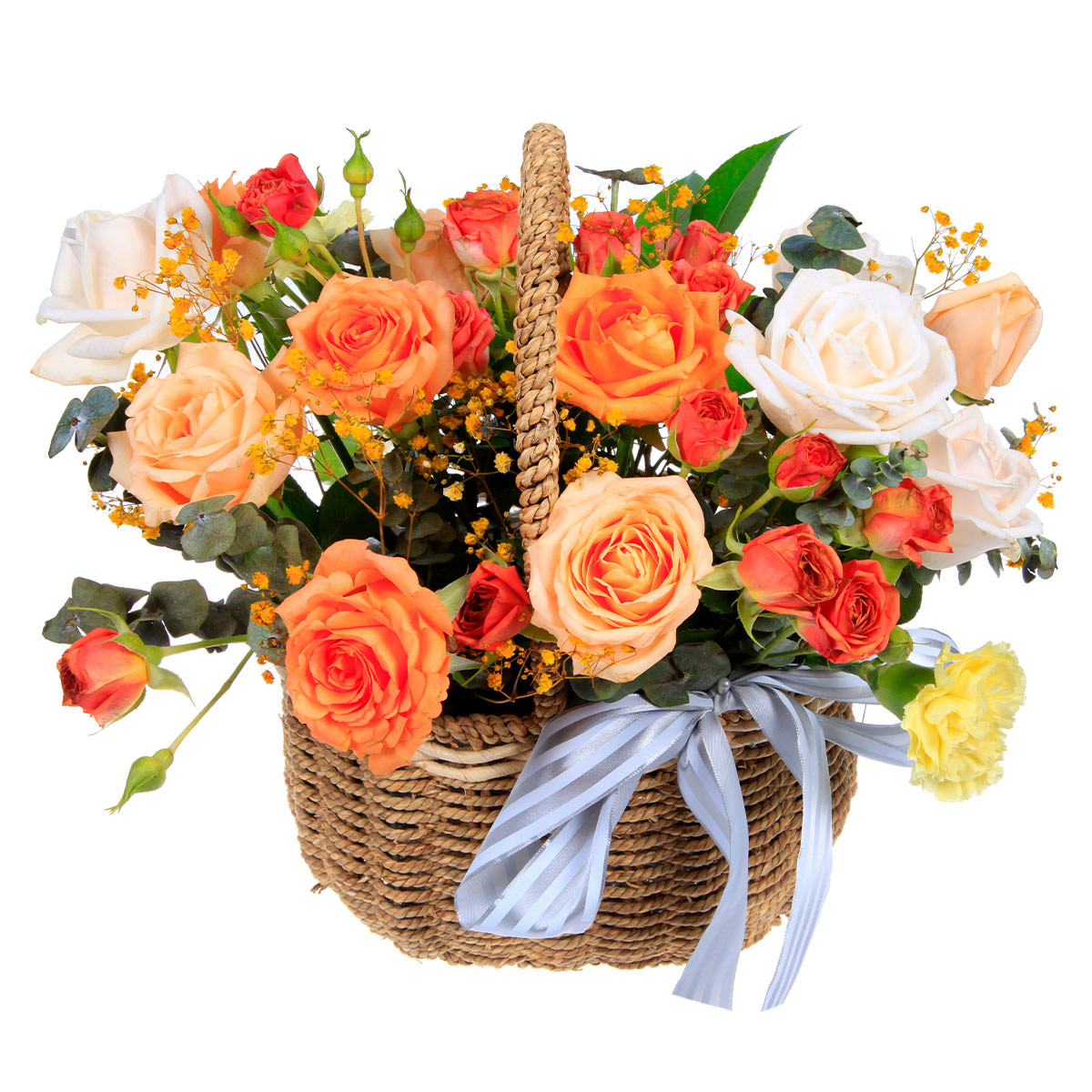 Роза одноголовая белая и оранжевая, роза кустовая красная, гвоздика желтая, гипсофила желтая. Упаковка (Корзина, оазис, ящик).