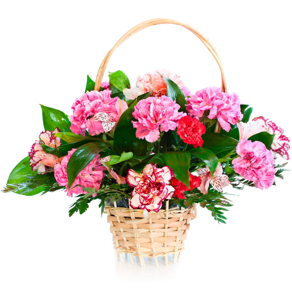 Гвоздика розовая, гвоздика мини красная, альстромерия розовая, аспидистра. Упаковка (Корзина, оазис, ящик).