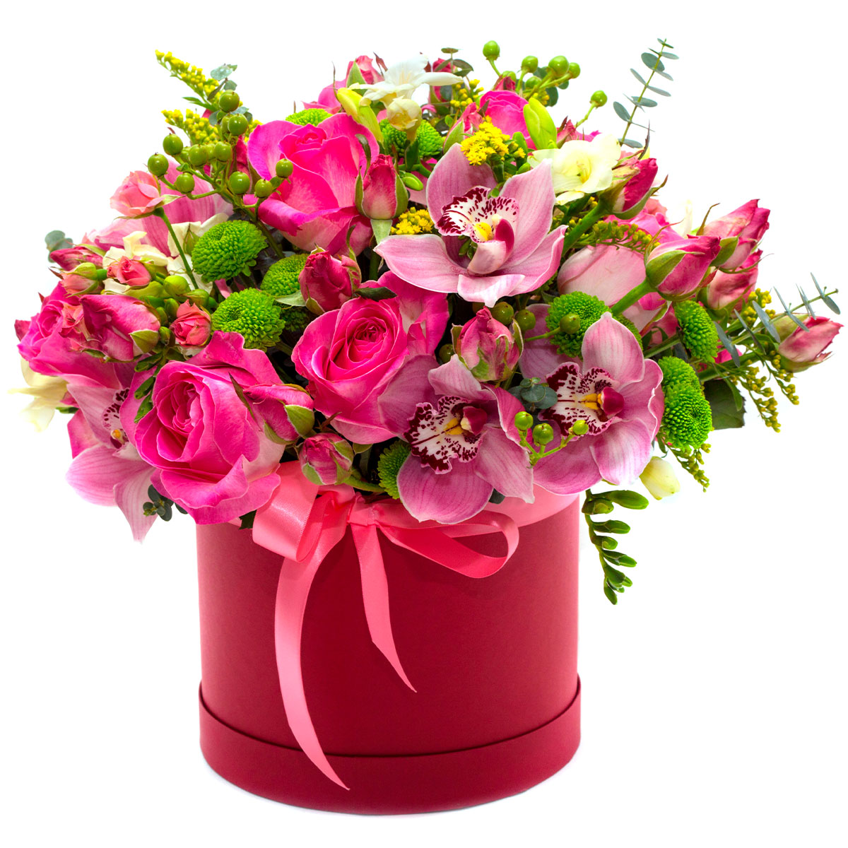 Орхидея розовая, роза одноголовая розовая, фрезия белая, хризантема кустовая зеленая, гиперикум, солидаго, эвкалипт. Упаковка (шляпная коробка, квадратный бокс, коробка сердце, оазис)