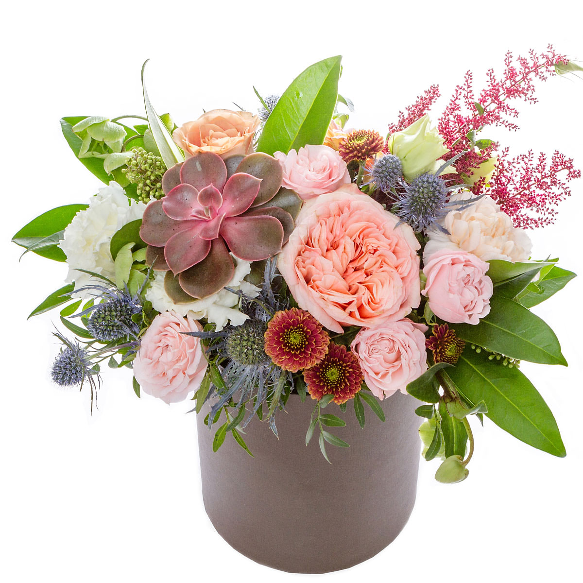 Роза пионовидная розовая, роза кустовая розовая, суккулент, эрингиум, эустома белая, хризантема кустовая красная, астильба, фисташка. Упаковка (шляпная коробка, квадратный бокс, коробка сердце, оазис)