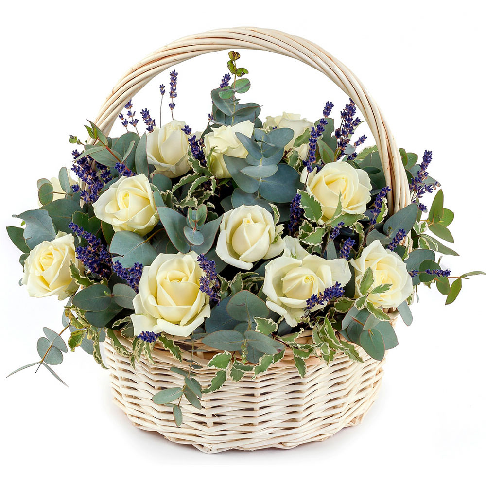 Роза белая, эвкалипт, лаванда. Упаковка (Корзина, оазис).